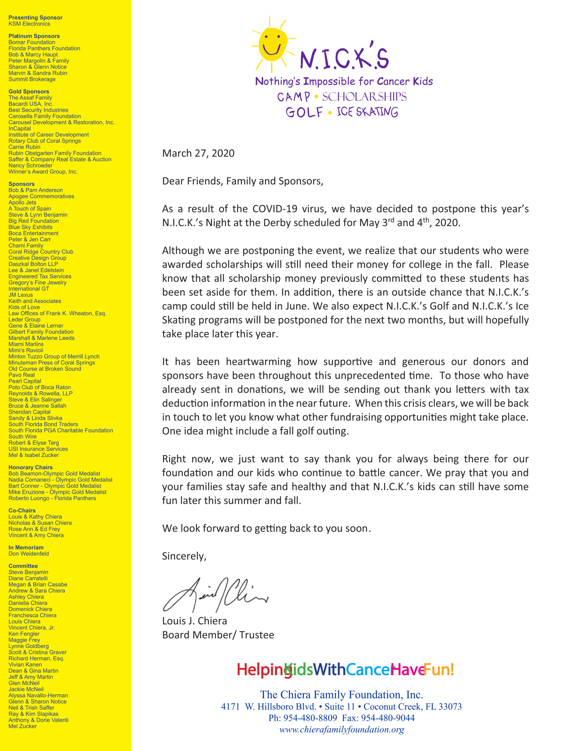 Proceeds from the 30th Anniversary Gala will help The Chiera Family Foundation send 150 children fighting cancer to summer camp at Camp Boggy Creek this July, and fund three more N.I.C.K.’s (Nothing is Impossible for Cancer Kids) college scholarships for young adults to attend the college of their choice. The Foundation has been active this year, completing two N.I.C.K.’s golf sessions through the First Tee of Broward for kids undergoing chemotherapy. Two N.I.C.K.’s Ice Skating programs have been scheduled for June 3rd and 10th through a grant from the Florida Panthers Ice Hockey team.