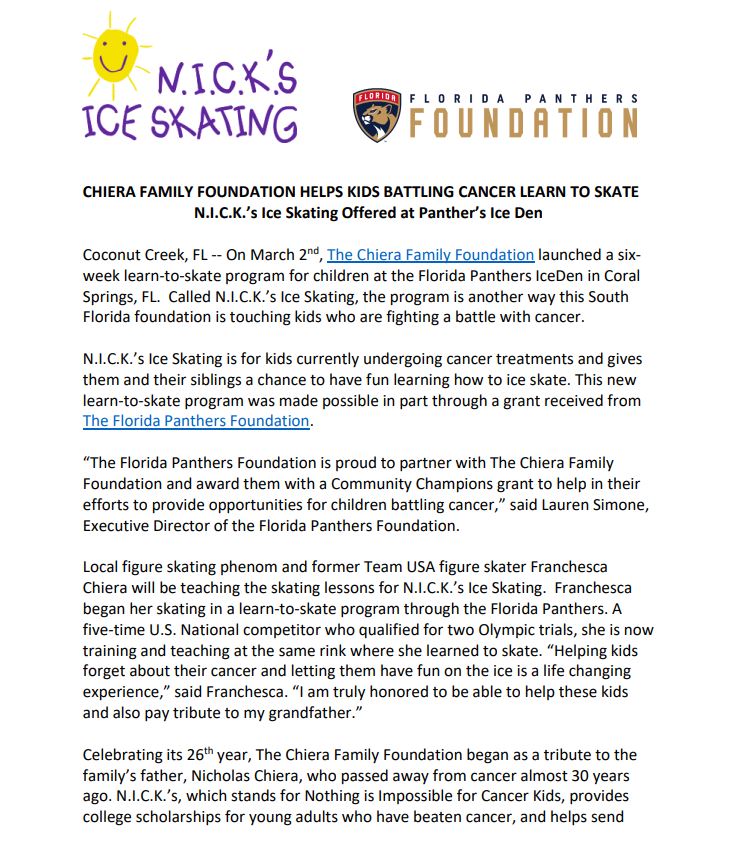 “We are thrilled that the Florida Panthers Foundation was able to provide a donation to The Chiera Family Foundation to help make an impact by supporting kids and families battling cancer.” said VP of Florida Panthers Foundation & Community Relations John Colombo. “To know that our support is helping children who face so much in their lives learn to ice skate and have fun with their friends and family while they are undergoing treatments is so rewarding. Hosting these kids at the Panthers IceDen to enjoy this positive experience is truly special.”