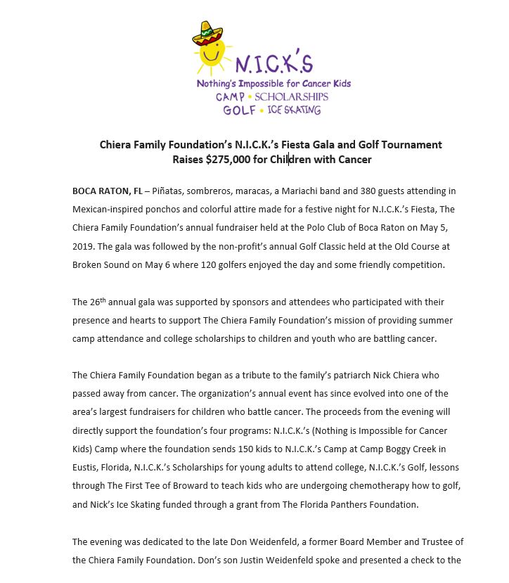 With the proceeds from N.I.C.K.’s Fiesta, The Chiera Family Foundation has now raised over $4 million to date for the cause. Over its 26-year existence, the foundation through its supporters has helped send 3,800 kids battling cancer to summer camp, provided over 32 college scholarships, sent over 80 children to N.I.C.K.’s Golf program and 12 to N.I.C.K.’s Ice Skating.