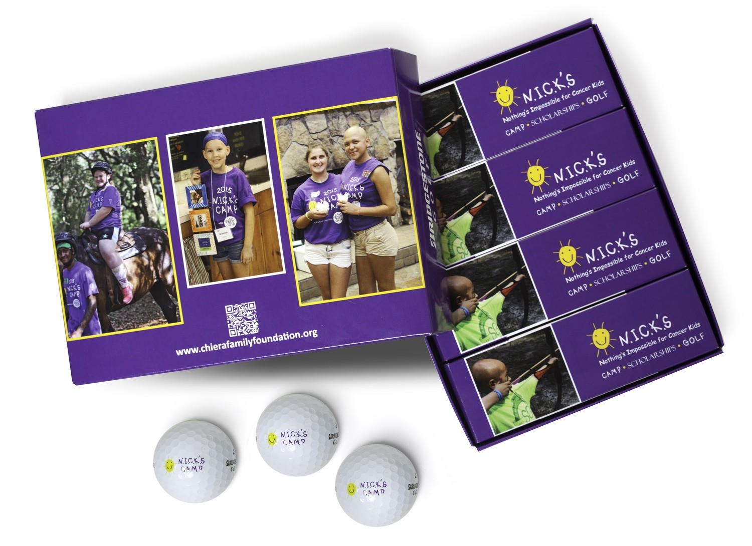 One Dozen N.I.C.K.’s Camp Golf Balls – Playing with these NICK’s CAMP golf balls can help kids and young adults battling cancer. These Bridgestone Tour B330RX golf balls feature a softer core designed to maximize compression for longer distance. The new patented Slip-res cover produces maximum green-side performance, higher friction for more spin from the rough, and less spin off the driver for increased distance.